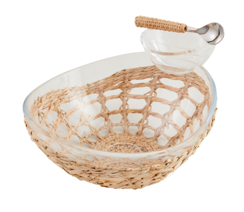 Woven Acrylic Chip & Dip Set is a stylish and functional 3-piece ensemble perfect for entertaining. The set includes an acrylic chip bowl with a removable dip cup, both elegantly encased in a woven seagrass exterior sleeve, adding a touch of natural charm to your table setting. Accompanying the set is a stainless steel spoon featuring a rattan handle, providing a comfortable grip and a cohesive look. The server measures 11 inches by 13 3/4 inches, offering ample space for your favorite snacks, while the spoon is 5 1/2 inches long, ideal for serving dips with ease. This set combines durability with a sophisticated design, making it a versatile addition to any gathering.