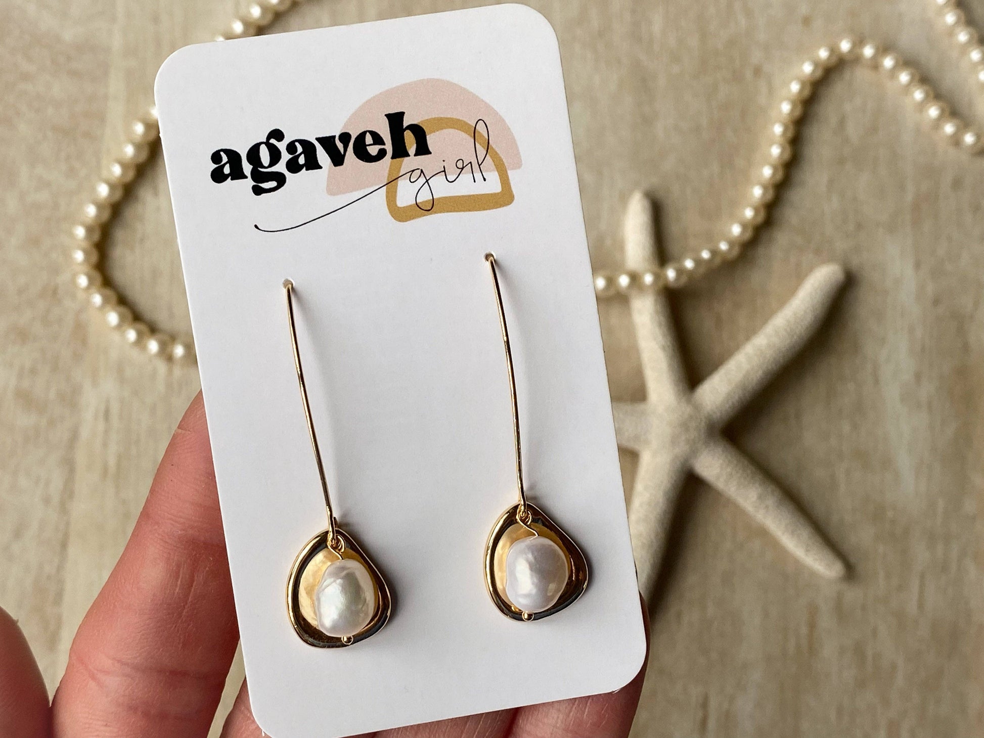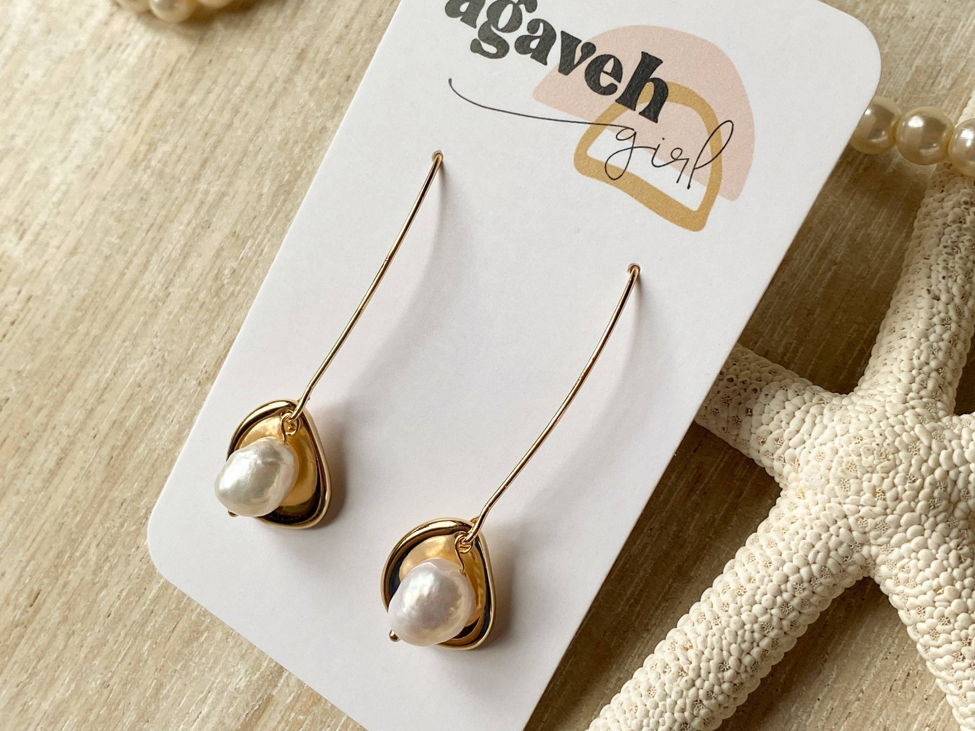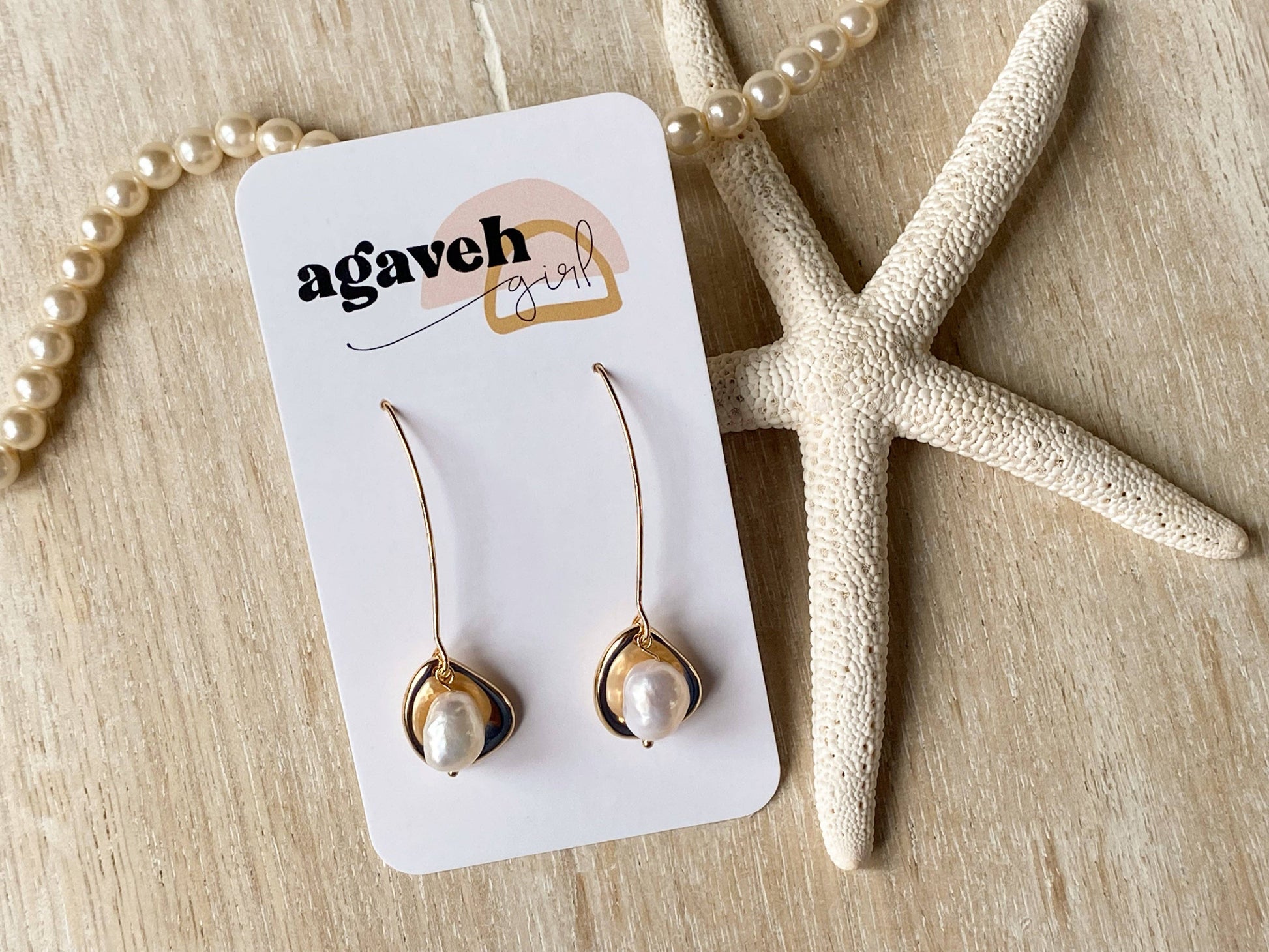 Delicate and luminous, these dangle earrings feature genuine freshwater pearls nestled in a rippled 14K gold-plated petal that gently cups each pearl and catches the light with every movement. Elegant yet organic, the sculptural gold form adds a modern coastal touch, making these earrings perfect for both everyday wear and special occasions. Lightweight, nickel free, and made with comfort in mind.