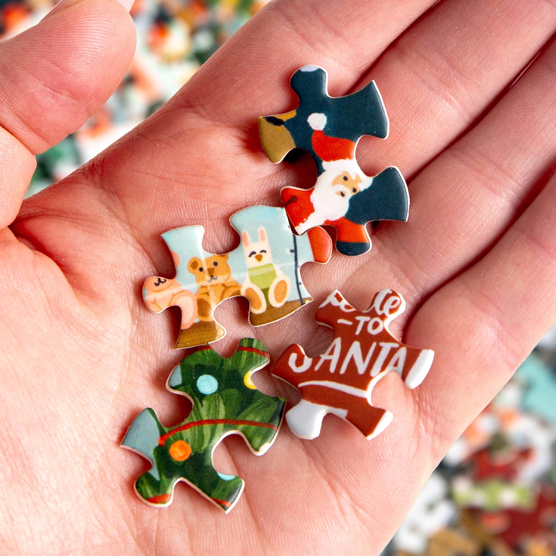 Step into a winter wonderland with our City Sidewalks - 1,000 Piece Jigsaw Puzzle! This enchanting puzzle captures the magic of Christmas in a bustling town, complete with a charming bakery, toy shop, and book store. Cars and holiday shoppers line the streets, while a towering Christmas tree lights up the scene. In the snowy foreground, ice skaters glide across the frozen pond while children joyfully build a snowman. And high above, Santa and his reindeer soar through the starry sky. This puzzle offers both a fun and heartwarming journey through the season. Gather loved ones for a cozy evening of puzzling fun, surrounded by the sights of a magical Christmas town. Whether as a gift or a personal treat, let the magic of Christmas come to life as you piece together this puzzle, creating memories to treasure for years to come!