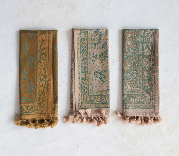 Cotton Printed Tea Towel w/ Design, Tassels & Loop, Multi Color, 3 Styles