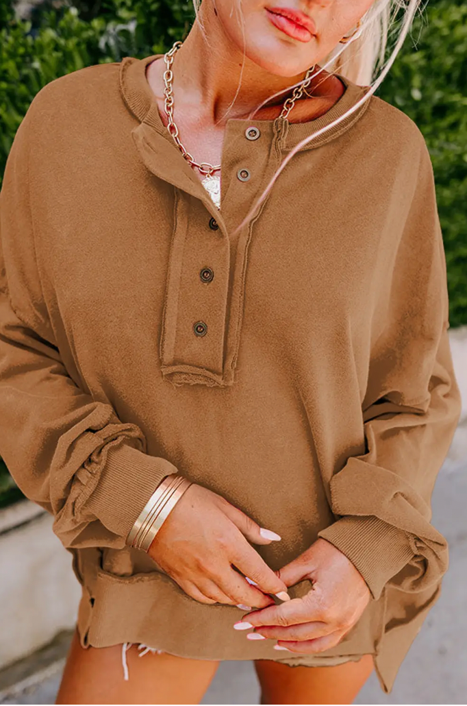 Drop Shoulder Henley Buttons Sweatshirt - Chestnut