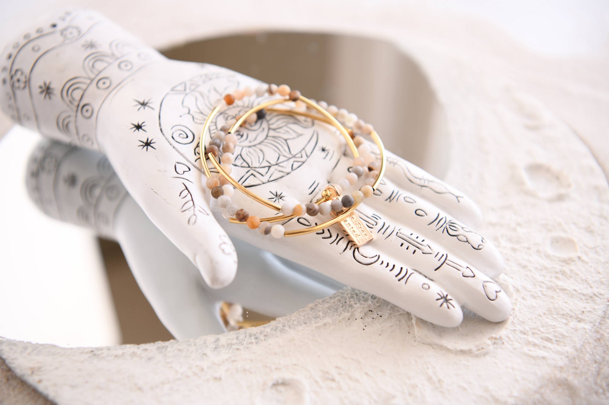 Shop our Gemstone Triple Wrap Bracelet Collection now. You plant one tree with each purchase. Handmade in the USA. These layering stretch bracelets are made using gold plated beads, genuine gemstones on stretch cord. One size fits most. We recommend displaying these laying flat wrapped up like a bracelet.