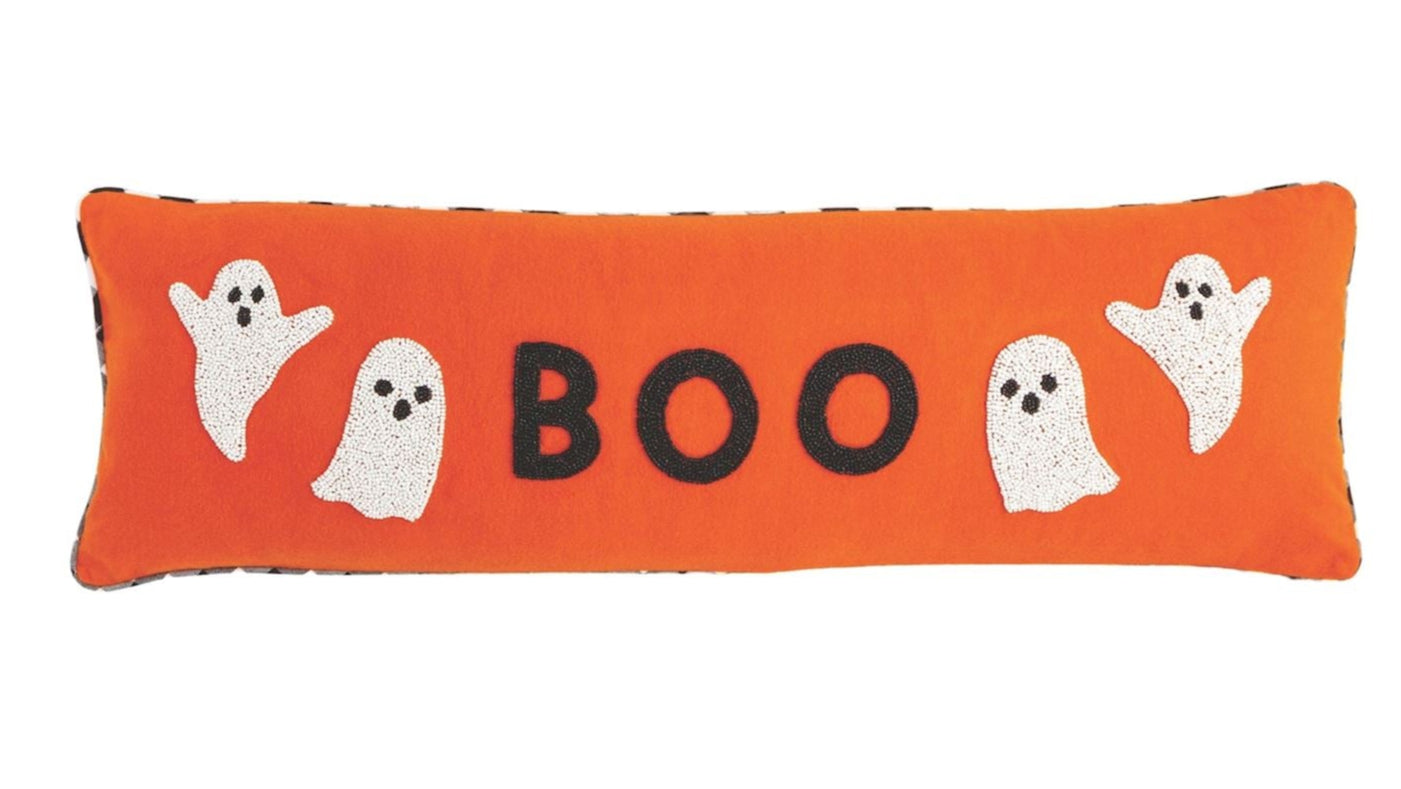 Orange cotton or natural canvas pillow features bead appliqués and contrast piping with coordinating back. Zipper closure.