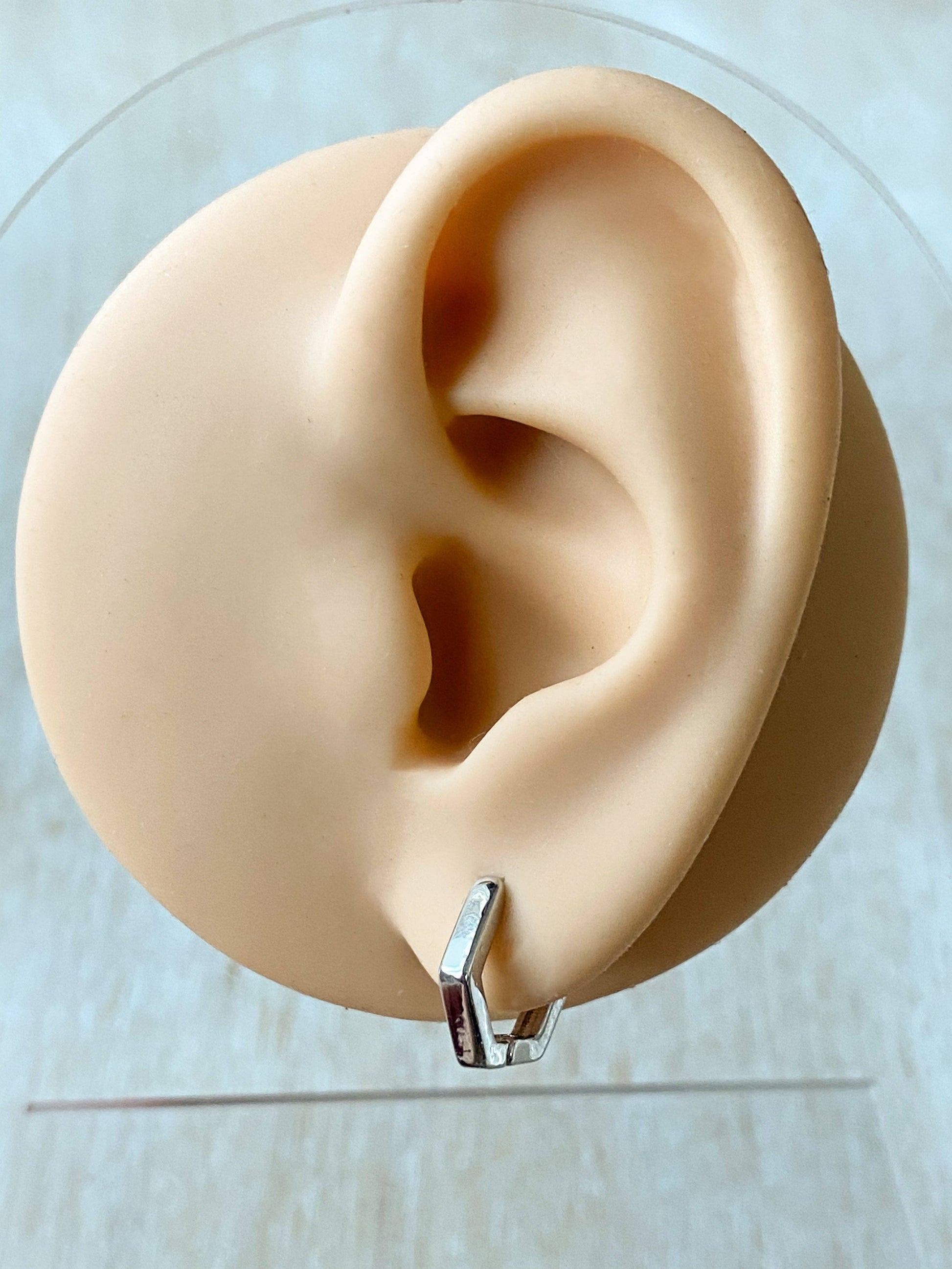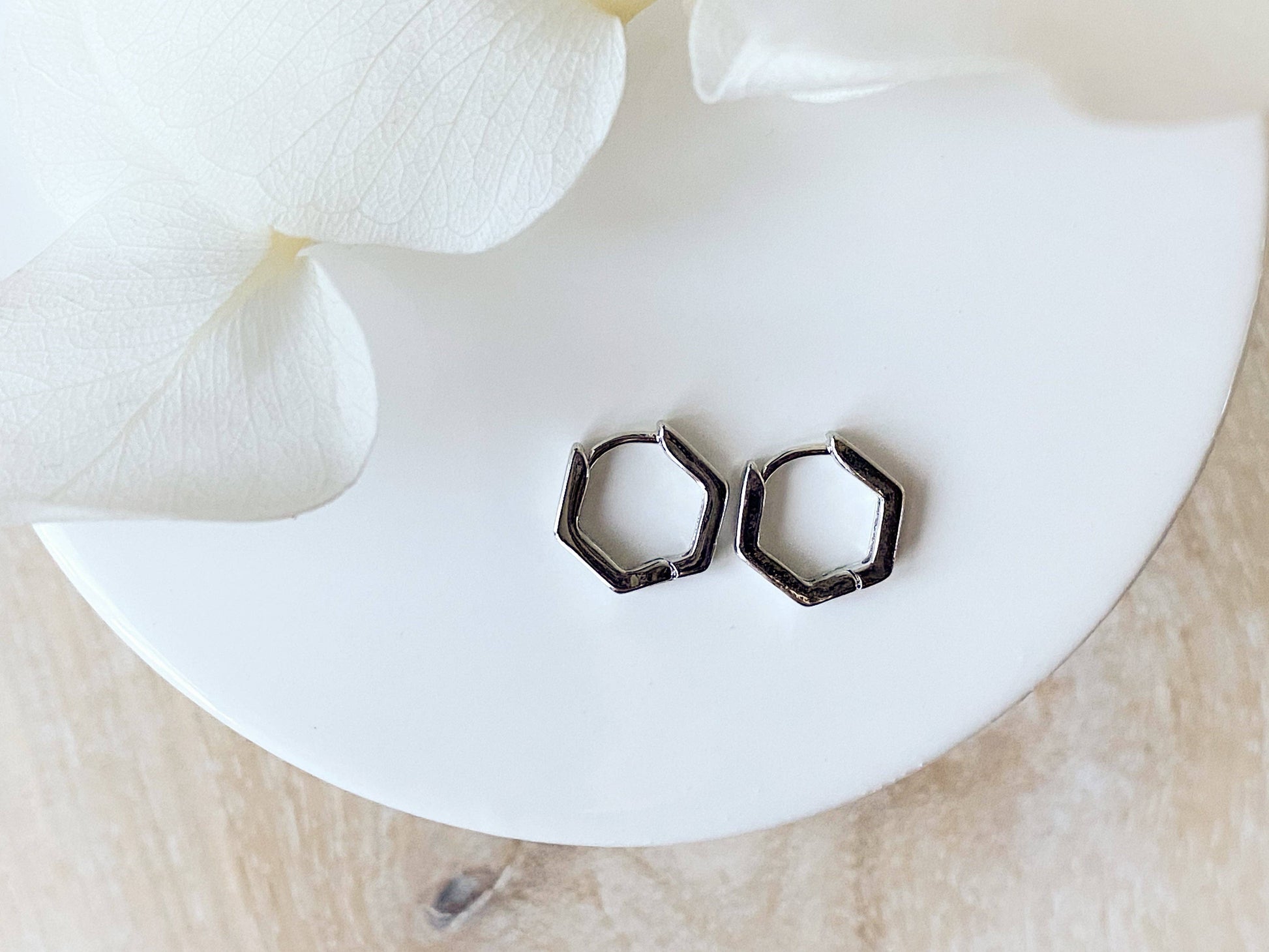 Elegant and minimalist, these Platinum-Plated Hexagon Huggie Earrings offer a refined twist on our classic Hexi Huggies. Slightly smaller in size, they provide a subtle yet sophisticated statement, perfect for everyday wear or layering. Crafted with care, they are nickel-free and designed to be comfortable for all-day wear, making them an ideal choice for sensitive ears.”